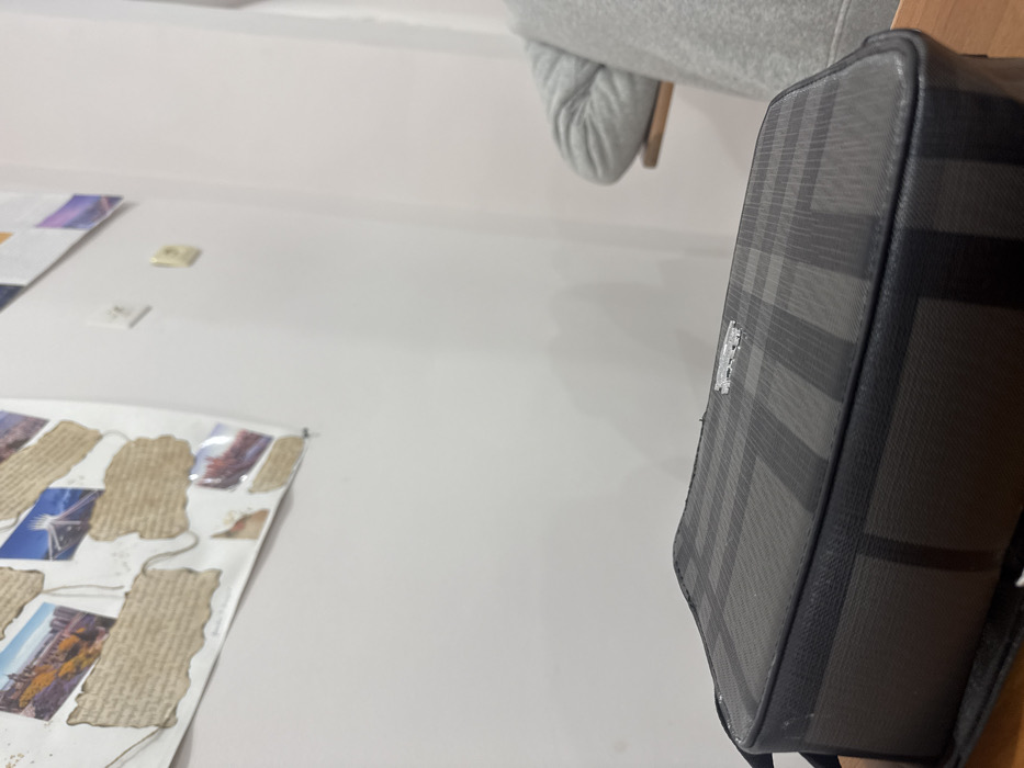 The image depicts an indoor scene, likely within an educational institution in Yerevan, Armenia. In the foreground, a dark gray and black plaid messenger bag with a silver metallic emblem is positioned on a light brown wooden desk or table surface. To the right, a person's upper arm and shoulder, clad in a light gray long-sleeved garment, are partially visible, suggesting the individual is seated at an adjacent desk. The background consists of a plain white wall. On the left side of this wall, a white display board is affixed, featuring multiple irregular-shaped pieces of paper with printed text, interspersed with several small photographs. Recognizable images include a landscape with yellow flowers and urban architecture (possibly the Yerevan Cascade) and a modern architectural structure (potentially the Armenian Genocide Memorial complex, Tsitsernakaberd). Thin strings connect some elements on this display. Two light-colored electrical outlets are present on the wall to the right of the display board. A portion of another document is visible higher on the wall. The environment is illuminated by artificial indoor lighting.