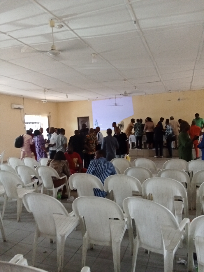 The image displays an indoor gathering in a large room located in Port Harcourt, Rivers, Nigeria