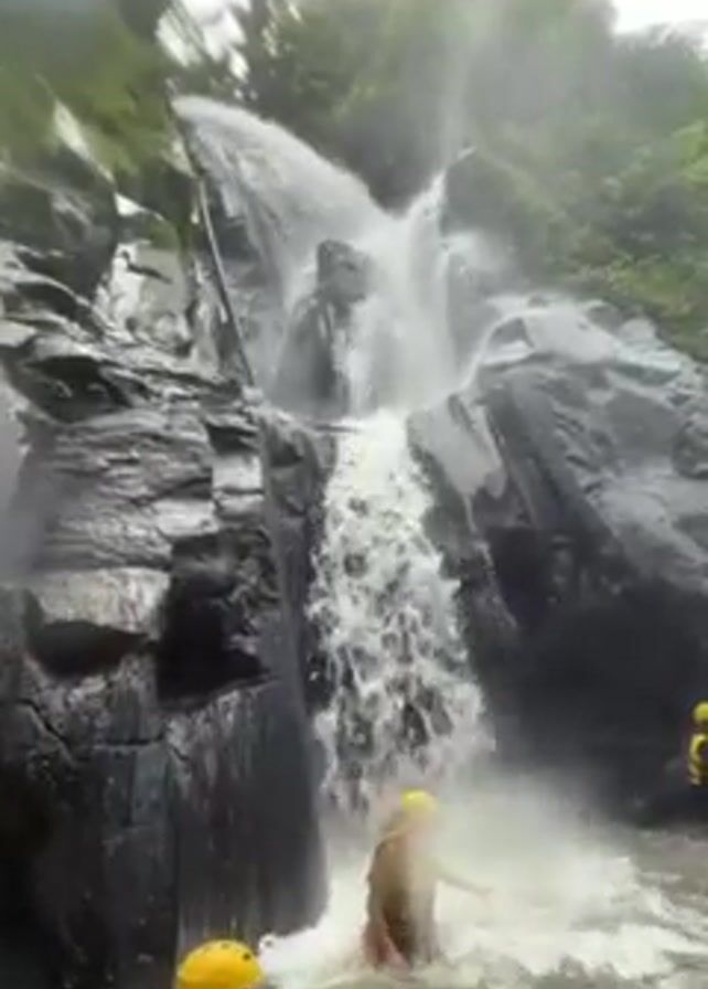 A group of people wearing yellow helmets and life vests are standing in the water at the base of a large waterfall. The waterfall is cascading over dark, rocky cliffs covered in lush greenery. The water is churning and misty, and the scene appears to be set in a natural, outdoor environment. One person is wading closer to the waterfall. The sky is overcast.