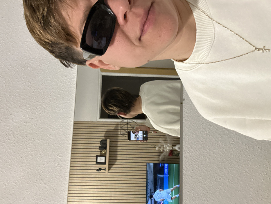 A person wearing sunglasses and a white sweatshirt with a cross necklace is seen in a mirror
