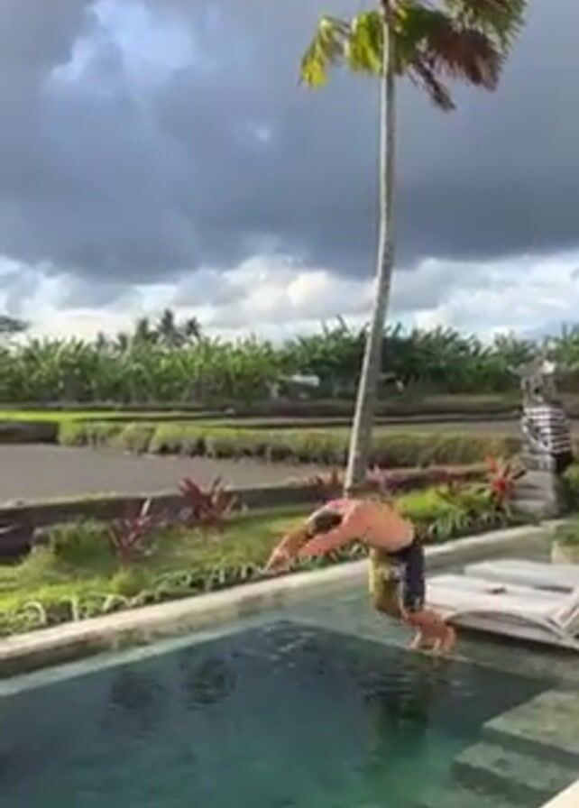 A man is performing a back flip into a swimming pool. The pool is surrounded by vegetation. In the background, there are rice paddies. The sky is cloudy. The camera moves slightly while recording.