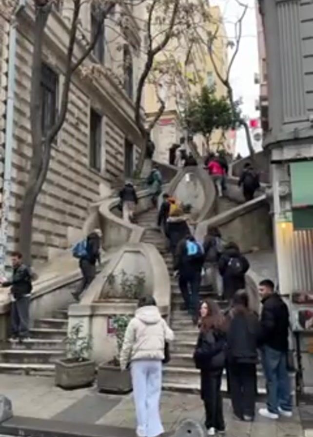 steep set of winding outdoor stairs with many people walking up and down. The stairs are made of stone and have a unique, curving design. There are buildings on either side of the stairs, and some bare trees are visible. Most of the people are wearing casual clothes and carrying backpacks. Some people are standing near the bottom of the stairs, watching. The overall atmosphere seems busy, with people moving in different directions. The weather looks overcast.