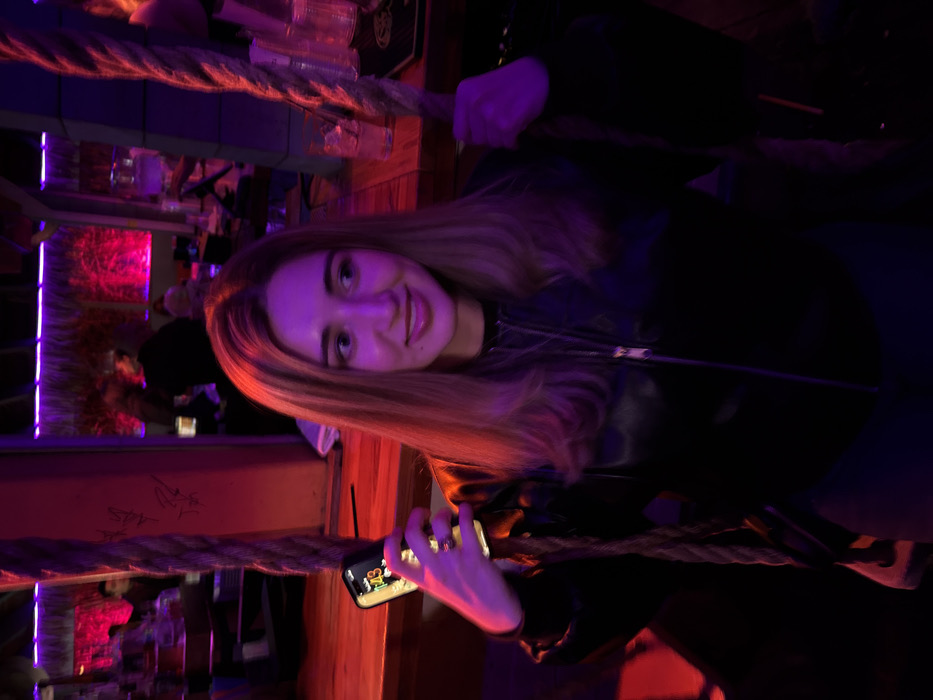 A woman with long blonde hair poses indoors. She's wearing a black leather jacket and holding a phone. The scene is dimly lit with pink and purple hues. A thick rope runs horizontally across the frame, partially obscuring the foreground and background. The setting appears to be a bar or similar establishment, evidenced by glassware and decorations visible in the blurred background.