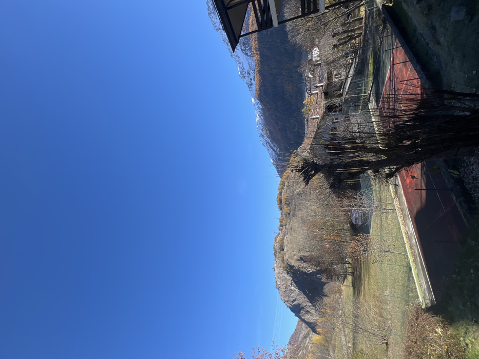 This image displays an autumnal, panoramic view of a mountainous landscape in La Thuile, Italy, under a clear, deep blue sky. No individuals, discernible actions, or interactions are visible. The scene encompasses a foreground featuring a red-surfaced sports court, likely a tennis court, marked with white lines and surrounded by green fencing. Adjacent to the court, to the left, is a grassy area dotted with bare deciduous trees and some low-lying shrubbery. A light-colored van is parked among trees further back on the left side. In the midground, a collection of traditional alpine buildings with terracotta roofs is clustered, indicating a village section. Directly to the right, partially framing the image, is the dark-colored roof and wooden balcony of a building, likely the vantage point of the photograph. The background is dominated by mountains. To the left, a large, rocky mountain face is visible, sparsely covered with bare trees and patches of yellow-orange autumn foliage. To the right, a higher mountain range features snow-capped peaks, with the lower slopes covered in dense coniferous forests displaying vibrant golden and orange autumn colors. The lighting is bright and consistent with a sunny day.