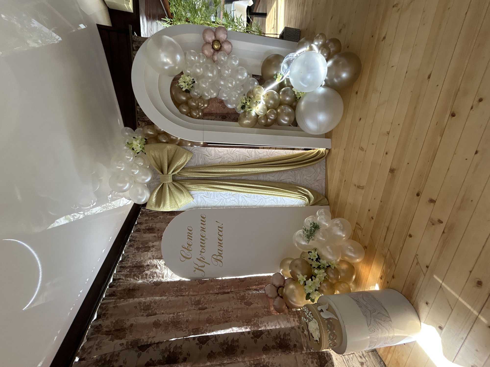 decorated area, likely for a celebration, possibly a baptism, with text in a Cyrillic alphabet