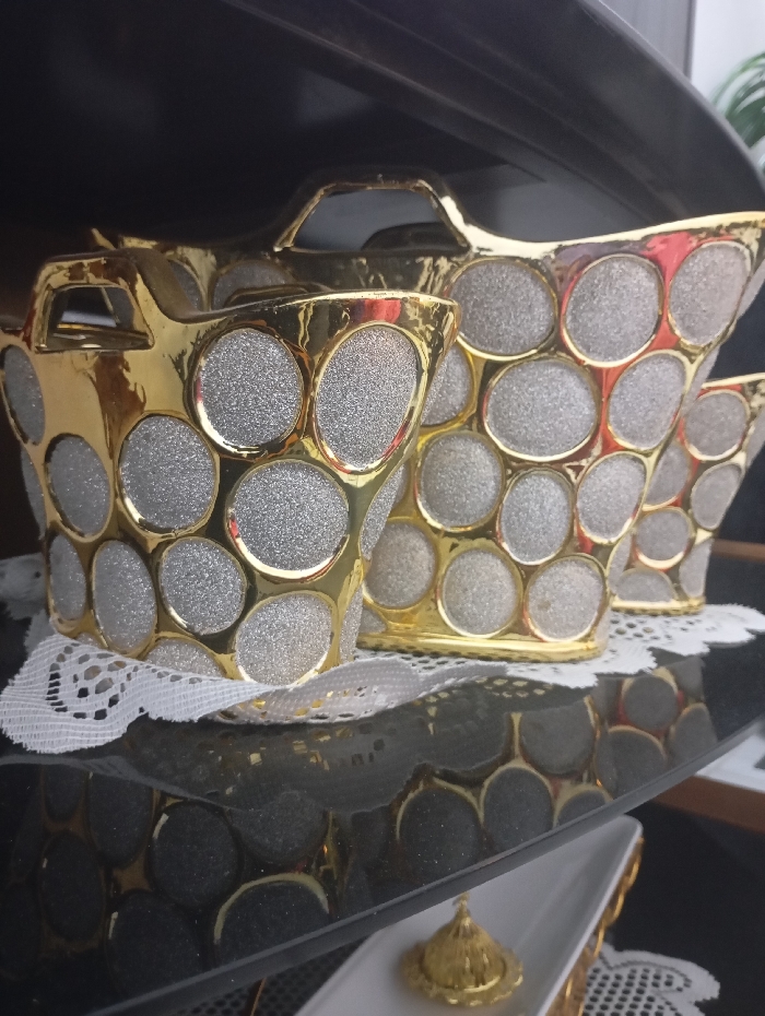 This image captures an indoor display in Nasiriyah, Iraq. Three decorative containers, gold-toned with silver-glittered circular inlays, are arranged on a white lace doily atop a dark, highly reflective surface, likely glass. The containers decrease in size from left to right; the center container is fully visible, while the one on the far left and the one on the far right are partially cropped. Each container features integrated handles. Below this display, a lower shelf holds a white rectangular dish featuring a small, golden, domed object on a stand, partially resting on another white lace doily. The background is dark and indistinct, with a suggestion of green foliage visible on the far right. No individuals are present, and the objects are stationary.