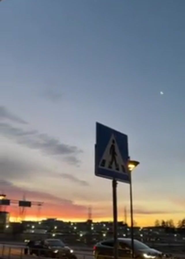 n outdoor scene at dusk. The sky is a gradient of colors, transitioning from a deep blue above to shades of purple and orange near the horizon, indicating either sunrise or sunset. A pedestrian crossing sign is prominently displayed in the foreground, along with a streetlight. Cars are parked in the background, suggesting a parking area or road nearby. As the camera pans slightly, it reveals a round road sign with a black X on it and an airport in the distance. The airport features a control tower and modern-looking buildings. Some people are visible walking in the background.