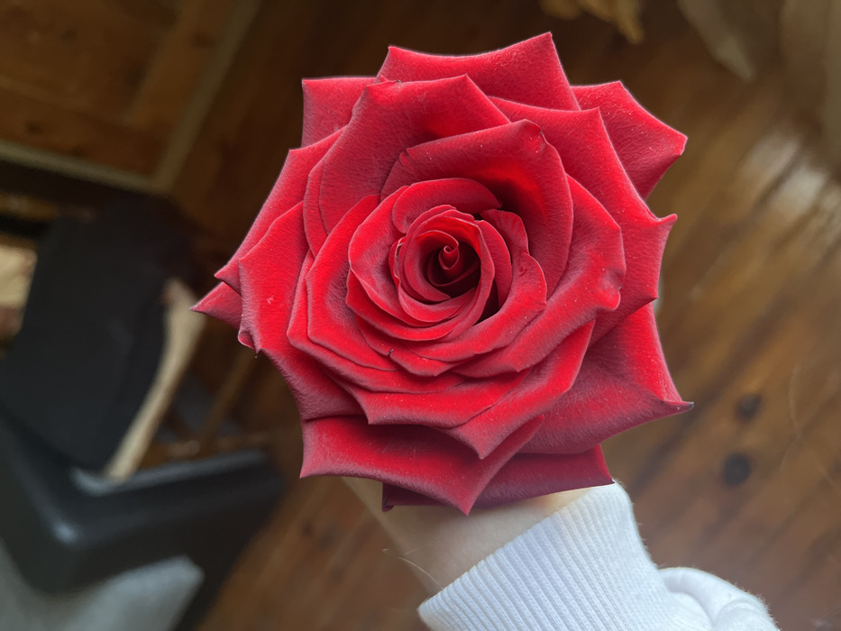 - "A human hand, partially obscured by a white ribbed long-sleeved garment, holds a single, fully bloomed deep red rose, positioned centrally within the frame" by FM-gYz712, licensed under CC BY 4.0