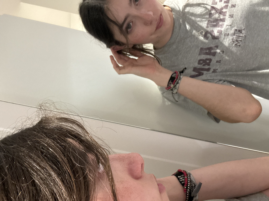 A person takes a selfie in the mirror. The person in the mirror is wearing a gray t-shirt with letters on it and several bracelets on her left wrist. She is touching her ear and looking toward the camera. The reflection in the mirror shows the top of another person's head, nose, and arm wearing the same bracelet. The reflection is slightly out of focus compared to the subject in the mirror.