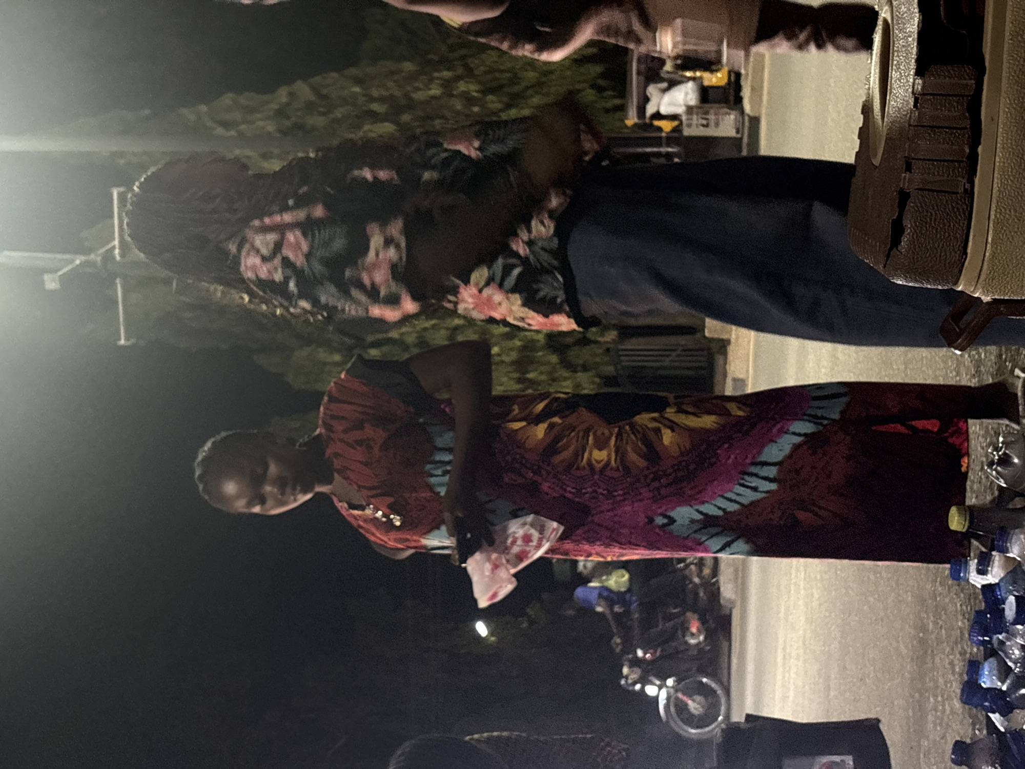 This nighttime image depicts a street scene in Lafia, Nigeria. In the foreground, a young female stands slightly left of center, facing forward with her head tilted down. She has dark skin, braided hair, and wears a long, short-sleeved dress with a multi-colored pattern of red, pink, blue, and yellow. She holds a small, clear plastic bag with white contents in her left hand and a dark rectangular object in her right. To her immediate right, a second female with dark skin and long, braided hair stands angled away, wearing a dark floral-patterned shirt and dark lower garments. Partially visible on the far left is a dark-clad torso and arm. On the far right, a brown-clad leg is visible next to a two-toned dark brown and beige cooler, which has a damaged top edge. On the ground in the left foreground, multiple clear plastic bottles with blue, yellow, and white caps are arranged. In the mid-ground, left of center, a person in a blue shirt is seated on a motorcycle with an illuminated headlight. The background features dark trees, a street light on a pole, and distant artificial light sources against a dark sky. A partial sign with white text is discernible in the far-right background.