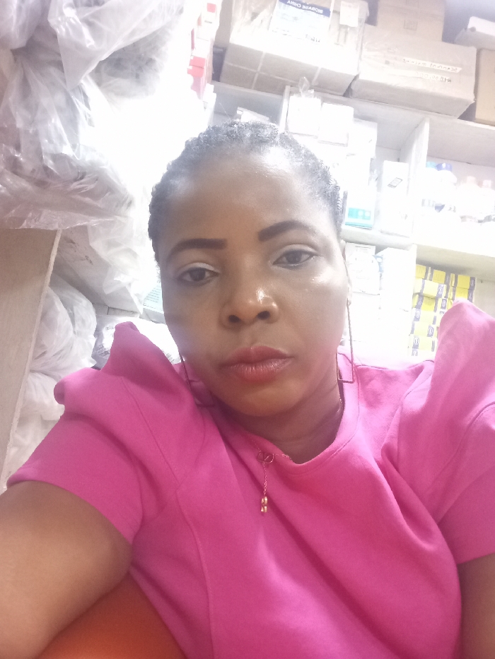 The image displays a head-and-upper-torso selfie of a woman, appearing to be of African descent, positioned centrally and looking directly at the camera with a neutral expression. She wears a bright pink short-sleeved top. Her facial features include defined eyebrows, light eyeshadow, and lips adorned with reddish-pink lipstick. She has short, dark hair. Visible accessories include a thin, gold-colored necklace with a small two-bead pendant and a long, thin, rectangular gold-colored earring on her right ear. The background indicates an indoor commercial or storage environment. To the viewer's left, stacked items wrapped in translucent white plastic are visible. To the viewer's right, white shelving units hold various boxed products, with one partially legible label reading "BIOARE CLIN." The specific location within Maiburiji, Nigeria, cannot be determined from the visual content of the image.
