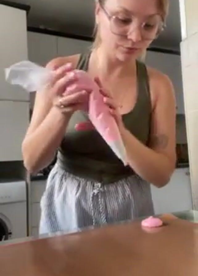 A young woman stands at a kitchen counter, piping pink meringue onto a silicone mat