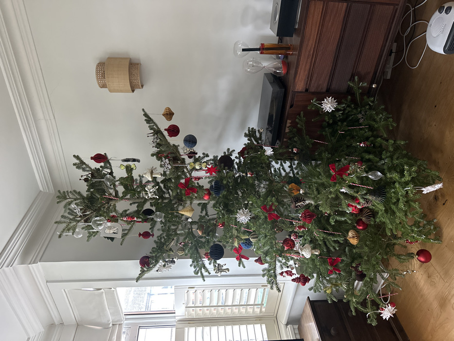 The image displays an interior room in the city of Folkestone and Hythe District, United Kingdom. A large, decorated natural Christmas tree occupies the center-left. The tree features numerous red bows, red and white striped candy canes, spherical and fan-shaped paper honeycomb ornaments in red, blue, and gold, white snowflake ornaments (some paper, some crystalline), clear glass baubles, small white and red mushroom-shaped figures, and pinecone ornaments. The room's walls are plain and light-colored, complemented by white crown molding at the ceiling. A window on the left side is fitted with white wooden plantation shutters; the top sections of these shutters are open, revealing an exterior view of what appears to be a residential street. A dark wooden chest of drawers or small cabinet is partially visible in the bottom-left foreground. On the right side of the room, a dark wooden sideboard, characterized by ribbed drawer fronts, is present. Its top surface holds a black audio component, an hourglass with red sand, a tall amber and black decorative object, and a silver electronic device. Above the sideboard, a light brown, layered rattan wall sconce is mounted on the wall. The floor is constructed of light brown wooden planks. In the bottom-right corner, a white portable electric fan heater with grey controls is situated on the floor, with white electrical cords visible extending from behind the sideboard. No persons or animals are present in the scene.