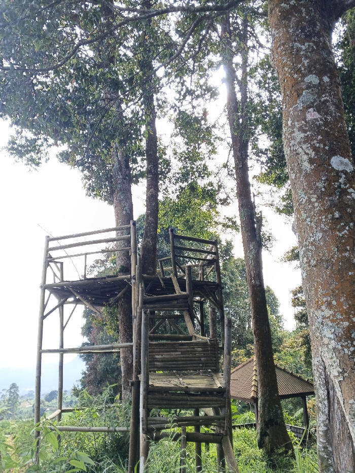 A wooden treehouse with two levels nestled among tall trees. The structure appears to be built from bamboo and is partially obscured by leaves and branches. The lower level is more dilapidated. A building with a corrugated metal roof is visible in the background, amidst lush greenery. The trees are covered in lichen and the lighting is bright, with the sun shining through the foliage.