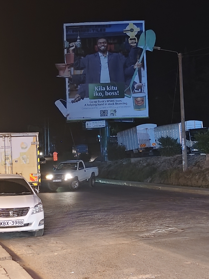 The image depicts a night street scene with various vehicles, including a white sedan with license plate KBX-398B and a white pickup truck. Above the road is a large billboard advertising Co-op Bank's MSME loan, featuring a man in a suit surrounded by tools and construction materials. The billboard reads "Kila kitu iko, boss!" and includes contact information for the bank. Further up the road, several large trucks are parked or moving.