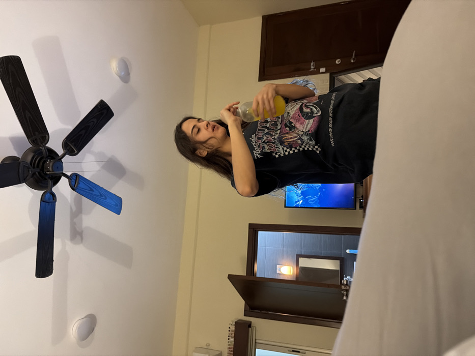 The scene depicts an indoor setting, identified as Acayucan, Mexico. A female individual with long, dark hair, wearing a dark graphic t-shirt featuring "Florida South Beach" text, is positioned centrally, actively opening a clear plastic bottle containing a yellow liquid. The environment appears to be a room, possibly a bedroom or hotel room. In the foreground, a white sheet or duvet covers the lower portion of the frame. Above, a five-bladed black ceiling fan is mounted on a white ceiling, with two blades exhibiting a bluish hue. Two white circular recessed light fixtures are also visible on the ceiling. The walls are a light beige color. To the left, an open dark wooden doorway reveals a bathroom area with dark tiled walls, a wall-mounted light fixture, a mirror, a sink, and a blue bottle on the counter. To the right, a closed dark wooden door with a silver handle is visible. Between the female individual and the left doorway, a flat-screen television displays an abstract blue and white image, resting on a dark wooden stand.