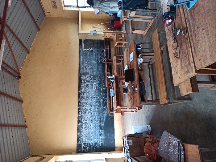 A classroom features rows of wooden desks, some with computers and other equipment. A chalkboard filled with equations and writing covers a large portion of the back wall. Light filters through windows at the top. A metal roof and beige walls define the space. Bags and boxes are stacked near the front. The classroom appears to be in use, but unoccupied in the image.
