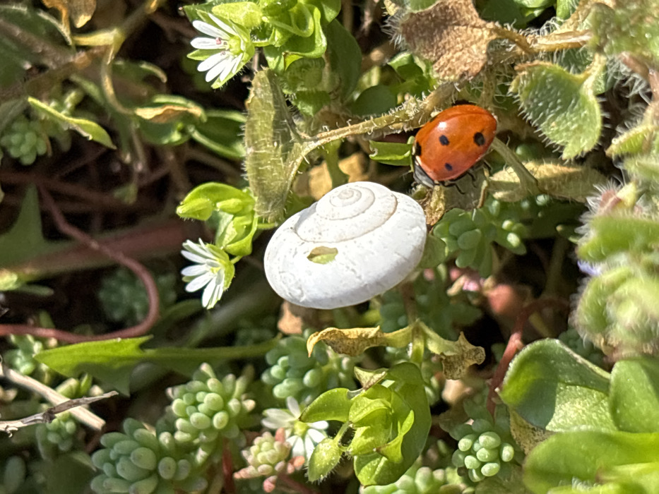 This image captures a close-up view of a natural ground cover environment, located in the city of Aidemir, Bulgaria. The scene features a single, live ladybug (Coleoptera: Coccinellidae) with a vibrant orange-red exoskeleton marked by black spots, positioned on a green plant stem in the lower right quadrant. Adjacent to and slightly above the ladybug, a single, empty, white land snail shell, approximately 1.5 cm in length, rests vertically amidst the foliage, exhibiting a clear dextral spiral pattern and a small, irregular aperture. The surrounding area is densely populated with various green plant species, including numerous clusters of small, rounded, light-green succulent leaves, slender green leaves, and several small white flowers with five petals and yellow centers. Some plant stems and leaves display fine hairs or textured surfaces. The scene is brightly illuminated by direct natural light, suggesting an outdoor setting under clear conditions.