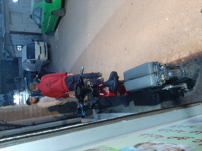 This image depicts an urban street scene in Al-Qadam Municipality, Syria, under low-light conditions, likely nighttime. In the immediate foreground, positioned on the paved street, is a red motorized bicycle or scooter. It features a black primary seat and a gray, rectangular padded rear seat, secured with blue straps. The handlebars have visible blue accents, and "KACIR" is emblazoned on the frame below the primary seat. Two adult males are visible standing on the street next to the scooter. The man closer to the viewer is seen from behind, wearing a red long-sleeved jacket with an Adidas logo and dark pants. To his left, another man is visible in profile, wearing a light-colored long-sleeved shirt and dark pants, with a beard, looking towards the left side of the frame. Both men cast pronounced shadows to their right. A third individual is partially visible further down the street behind the two men. The background features parked vehicles and buildings. A white enclosed utility van or small truck is parked further down the street, followed by a green sedan. Buildings with concrete or stucco exteriors line the street, one showing a roller shutter and an air conditioning unit. On the far left, a reflective surface, likely a window, displays a partial poster with an image of a baby and some Arabic text. The street surface is paved, and minor debris is visible near the green sedan.