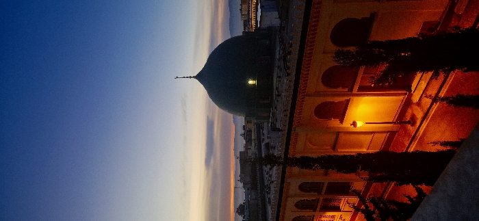 A nighttime cityscape features a prominent dome illuminated with a single light. A building with arched windows, bathed in warm orange light, occupies the foreground. The sky transitions from deep blue to soft orange hues on the horizon. The silhouettes of trees add depth to the scene, while hints of distant buildings peek through the twilight. The image is oriented sideways.