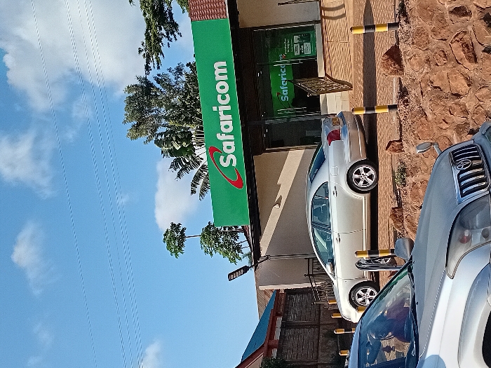 A Safaricom store stands with a prominent green sign. Parked outside are two vehicles, one white and partially visible, and another silver. The building features a stone wall, and a blue sky with scattered clouds is visible above, punctuated by power lines and trees. The photo is rotated counter-clockwise.