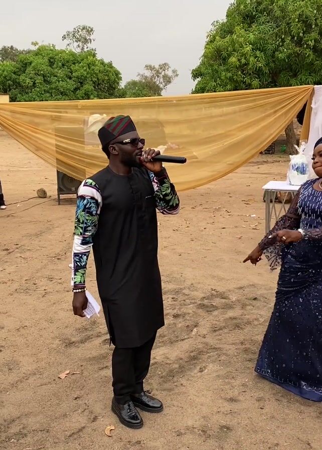 The scene takes place outdoors during the day at what appears to be a wedding or party. A man stands holding a microphone and a piece of paper, presumably acting as an MC or singer. He is wearing a black outfit with colorful sleeves and sunglasses. Two women dance in front of him, both wearing blue dresses. The scene is set against a backdrop of a sandy lot with a gold fabric backdrop and a white tent with floral decorations. Behind them are trees and a partially visible building. A speaker and other people are present in the background, suggesting a lively and celebratory atmosphere.