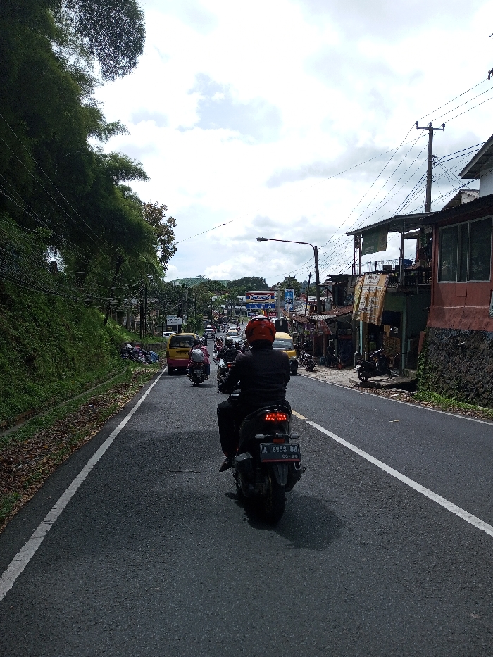 The image depicts a street scene in the city of Taohom, Laos, under an overcast sky. A dark grey asphalt road, marked by a solid white line on its right side, dominates the foreground. A person wearing a black jacket, black pants, and a red full-face helmet is seen from behind, operating a black scooter. The scooter's red taillights are active, and its visible license plate is 'A 6953 BU'. On the left side of the road, a steep, vegetated embankment rises, covered in dense green foliage, including bamboo. A narrow drainage channel runs alongside the road. Further down the embankment, a collection of bagged refuse is visible. Overhead utility poles and numerous power lines traverse this area. On the right side of the road, a series of mixed-use buildings, varying in construction materials such as concrete, brick, and corrugated metal, line the street. Multiple utility poles and an overhead street lamp are present. Several motorcycles are parked adjacent to these structures. The background shows the road extending with a slight curve, populated by a line of vehicles including multiple motorcycles and at least one yellow minivan. A building with a prominent blue and red sign is visible in the distance. The horizon features vegetated hills beneath a predominantly cloudy sky.