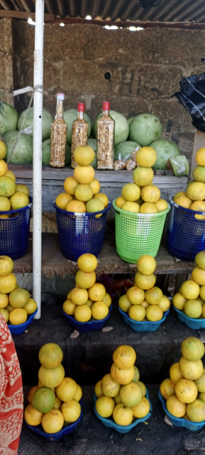 The image displays a static retail scene at an outdoor market stall in the city of Unknown, Unknown. The primary subjects are numerous light green to yellowish-green spherical fruits, consistent with grapefruits or pomelos, arranged for sale. These fruits are systematically piled into pyramidal stacks within at least seven plastic baskets: four dark blue, one light green, and two light blue/turquoise. Four of these baskets are positioned on a lower surface, while three are on an elevated, makeshift wooden shelf covered with a coarse, dark fabric. Behind the fruits on the upper shelf, a substantial quantity of large, light green spherical produce, possibly gourds or large melons, are amassed against a textured, light brown wall. This wall exhibits a rough, block-like construction. Three clear glass bottles, each filled with shelled peanuts or a similar granular product and sealed with either a red or white cap, stand upright on the upper shelf in front of the larger fruits. Two smaller clear plastic bags containing peanuts are also visible on this shelf. Overhead, a dark corrugated metal roof extends partially into the frame, indicating a covered area. A white vertical pole, likely supporting the stall's structure and secured by a piece of rope, is prominent on the left side. The foreground and lower left reveal a red and white patterned fabric, possibly an item of clothing or a covering. No individuals are present, and no direct actions or interactions are depicted within the visible frame; the scene focuses solely on the arranged merchandise.