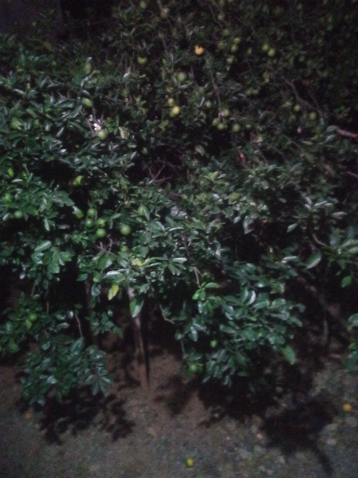 A tree laden with round, green fruit under low lighting conditions. The foliage is dense, and the fruit is scattered throughout the branches, some appearing yellowish. Dark shadows are cast on the ground beneath the tree, contributing to the overall dim atmosphere. The scene appears to be captured at night or in a very shaded area.
