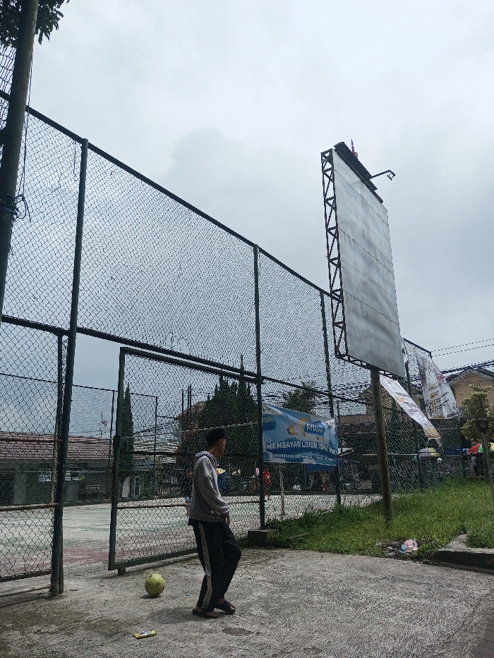 An overcast day reveals a recreational area with a chain-link fence surrounding a concrete surface. A young man stands on the concrete near a yellow soccer ball. Behind the fence are buildings and various banners, including one that says "MEMBAYAR LISTRIK TEPAT WAKTU!". To the right, a tall, rectangular structure stands near a grassy area. The sky is gray and cloudy.