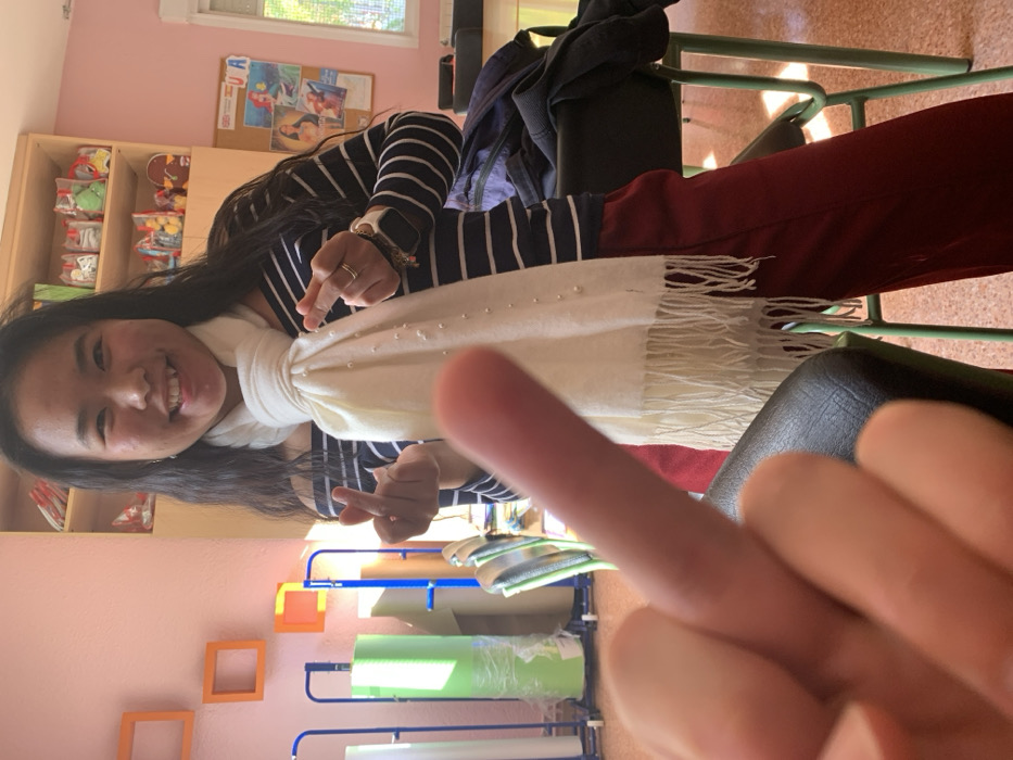 The scene is an indoor room located in Alcorcón, Spain, characterized by light pink walls and natural light entering from a window on the right. A young East Asian female, appearing to be in her late teens or early twenties, with long dark hair, stands in the midground, smiling directly at the camera. She is dressed in a dark blue and white striped off-the-shoulder top, dark red trousers, and a cream-colored scarf adorned with small white beads, tied around her neck. She performs a "finger heart" gesture with the index finger and thumb of both hands. A ring is visible on her right ring finger, and a watch or fitness tracker along with multiple bracelets are on her left wrist. In the blurred lower-left foreground, a light-skinned hand is prominently displayed with the middle finger extended, directed towards the female subject. The background on the left features two blue-framed stands holding large rolls of material, one light green and one light brown. Three empty orange square frames are mounted on the pink wall above these stands. To the right, behind the subject, a light brown wooden shelving unit contains various small, colorful objects. Adjacent to the shelves, a cork board is affixed to the pink wall, displaying images of Disney's Ariel and text that includes "British Council" and "UA". A dark-colored backpack or bag is draped over a green-framed chair positioned behind the female subject. The overall environment suggests an educational or creative workshop setting.