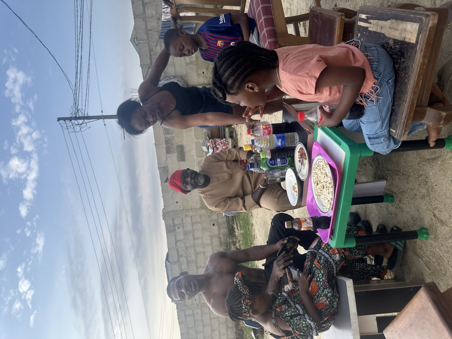 This image captures an outdoor gathering of six individuals in Langbasa, Nigeria, set against a backdrop of a concrete block wall and a utility pole under a partly cloudy sky. In the foreground, a small, dark-topped table with green legs serves as the central point. On the table, a pink tray holds a large plate of what appears to be a light-colored snack, possibly popcorn. Other items include smaller plates with food, a clear glass, and multiple bottles of beverages, including Coca-Cola and various spirits. Seated to the left of the table is a shirtless adult male with a dark complexion, wearing black pants and slippers, looking right. Next to him, on a small grey-topped stool, a young girl with a colorful patterned dress and matching headband is engrossed with a mobile phone. At the center, behind the table, an older adult male with a gray beard and a red cap is seated, wearing a light brown traditional outfit. He is smiling and looking towards the right. To the right of the table, an adult female in a black tank top and denim shorts stands, leaning forward and interacting with a young girl. This girl, with braided hair, wears a peach t-shirt and blue jeans, holding a Coca-Cola bottle while looking up at the woman. To their far right, a young boy in a blue soccer jersey sits on a padded wooden chair, observing the scene. The ground is composed of sand or dirt. In the background, beyond the concrete block wall, a utility pole with overhead wires is visible, along with distant structures and what appears to be laundry hanging on a line. The scene is illuminated by daylight.