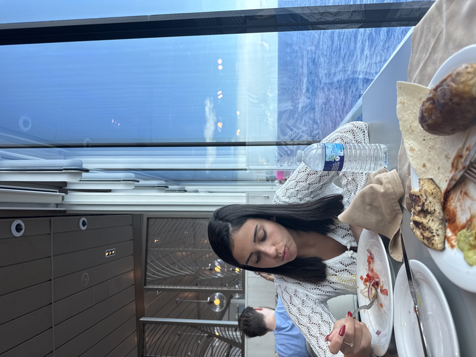 The scene depicts a dining area on a ship, characterized by large windows overlooking the open ocean under a clear blue sky with sparse clouds. In the foreground, a young adult female with dark hair wears a white, open-knit cardigan over a yellow garment. She is seated at a grey table, actively eating from a white plate containing salad remnants, using a fork held in her right hand, which has red nail polish and a ring. Another white plate on the table holds a grilled chicken breast, a tortilla, a baked potato, and traces of green and red sauces. A beige napkin and a plastic "True" brand water bottle are also on the table. In the background, partially visible, a male in a blue t-shirt is seated at another table further away. The interior features a modern ceiling with recessed lighting and decorative metallic screens.