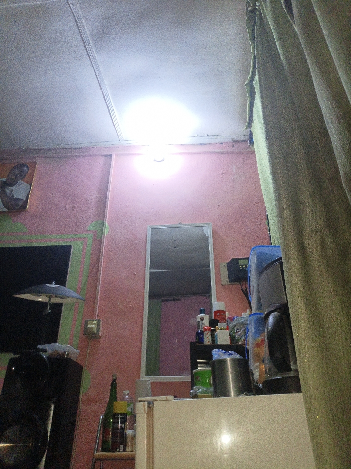 The image presents an interior space, possibly a room, with pink walls and a white ceiling. A curtain is visible on the right. A mirror hangs on the wall, reflecting another room painted pink. A black TV stands on the left with a lamp above. On top of what appears to be a refrigerator are various items, including bottles, containers, and a coffee maker. An electrical panel is on the wall above the refrigerator. A framed picture of a man is on the wall to the left. The light from an overhead fixture is very bright. The location is Gwagwarwa, Nigeria.