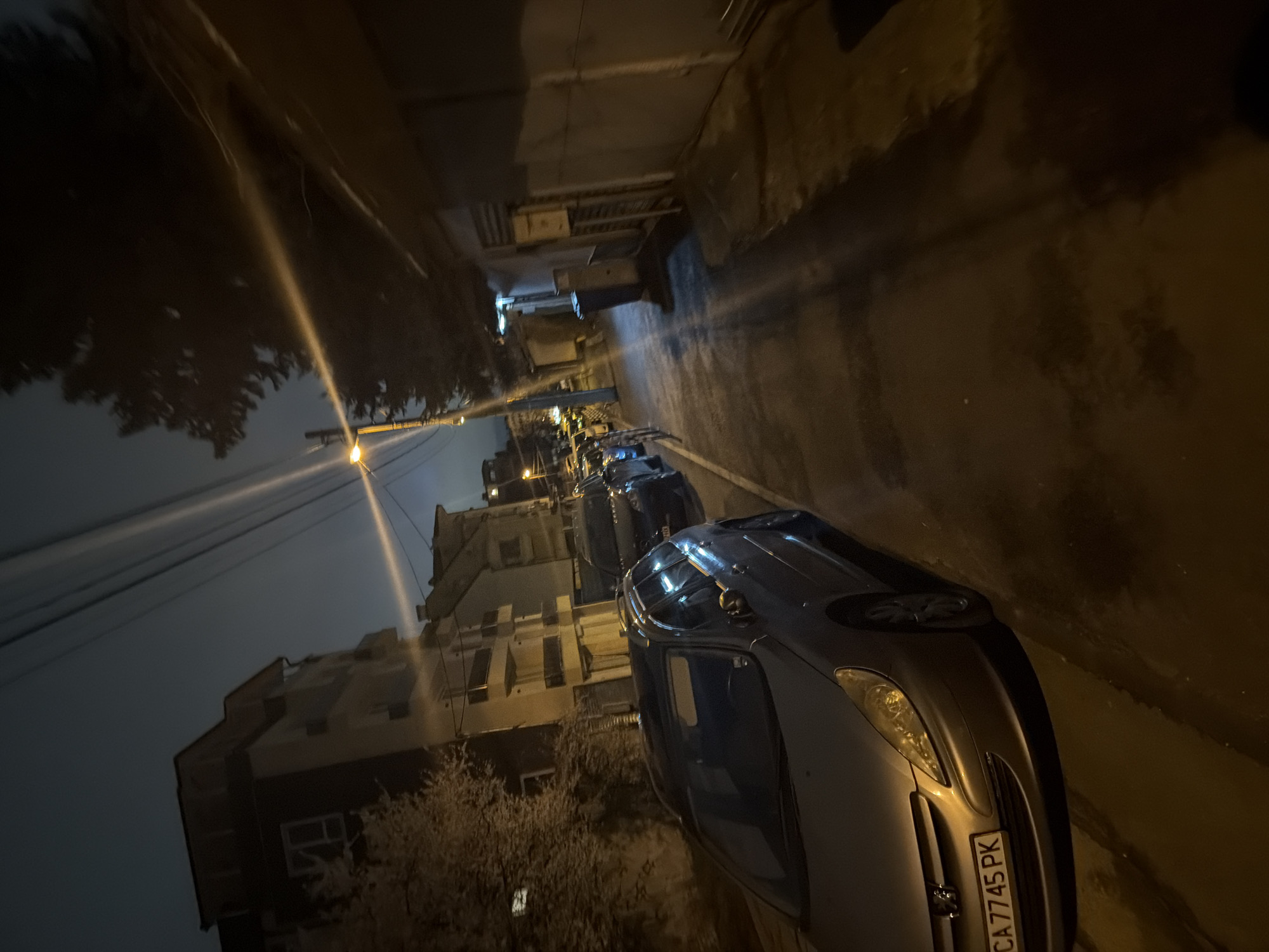 The image depicts a narrow street in Sofia, Bulgaria at night. Several parked cars line the right side of the street. The car closest to the viewer is a silver vehicle with a Bulgarian license plate "CA7745 PK." The street is illuminated by overhead streetlights, casting shadows and creating a dim atmosphere. Buildings line the left side of the street. Trees with leafless branches are present near the buildings, contributing to the urban landscape. The scene is generally quiet and unremarkable.