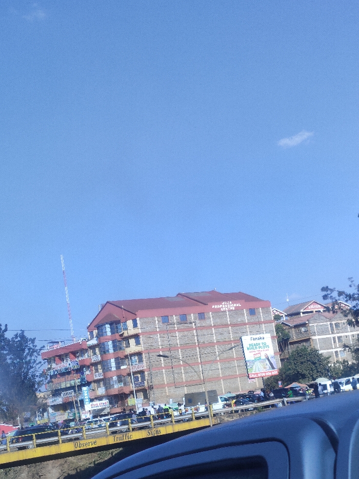 cityscape with several buildings under a clear blue sky. A tall antenna rises next to one building. A banner on a building advertises "Fanaka," promoting "READY TO BUILD PLOTS" with a phone number. Another building is named "JUJA PROFESSIONAL CENTRE". The word "STUDIO" is visible on another building. At the bottom, a bridge with the sign "Observe Traffic Signs" spans over a road with cars. Part of a car is also visible in the foreground.