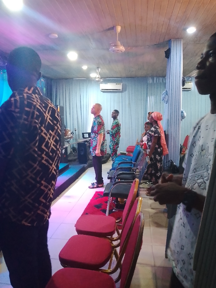 An indoor scene in Mgbuoshimini, Nigeria, depicts a gathering within what appears to be a church or event hall