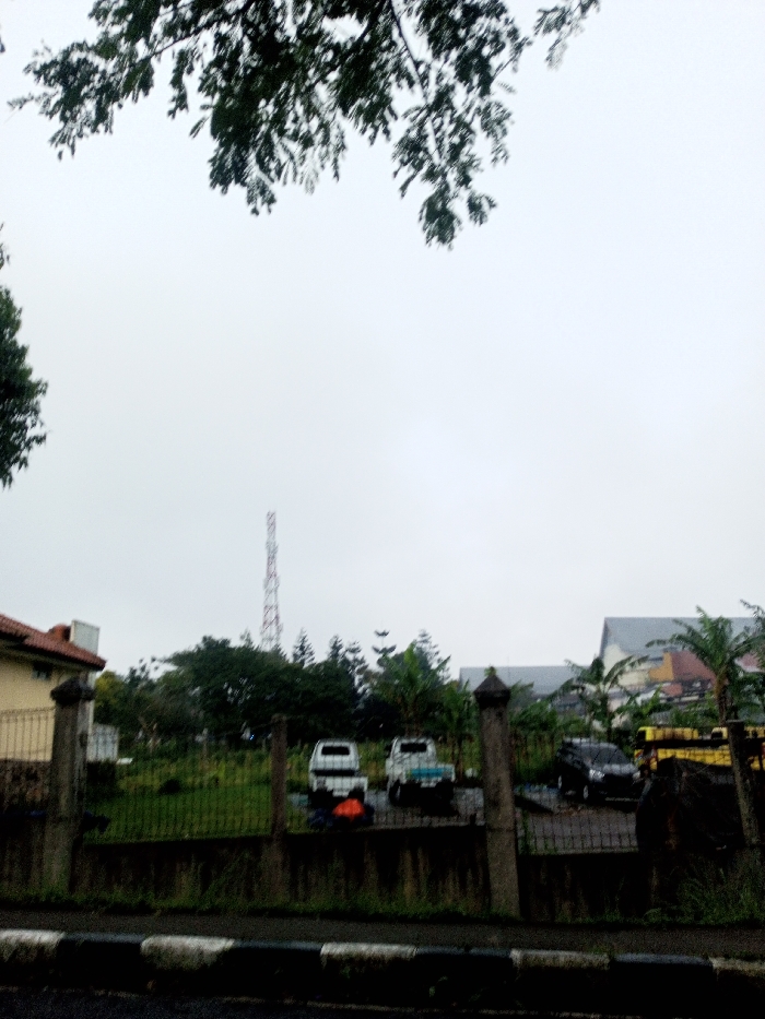 The image depicts an outdoor scene in Chagzam_Pam, Bhutan, under an overcast sky. The foreground features a dark asphalt road with a black and white striped curb. Behind the curb, a metal fence with concrete pillars guards a property. Within this property, a grassy area hosts several parked vehicles: a white pickup truck, a lighter-colored pickup truck, and a dark SUV/minivan. A bright orange-red object or tarp lies on the ground between the two pickup trucks. Various trees and shrubs, including palm-like trees, populate the property. In the background, a tall, slender red and white lattice communications tower dominates the skyline to the left of center. To the far left, a building with light walls and a reddish-brown tiled roof is partially visible. Multiple buildings with large, sloping grey roofs are visible in the right background. Dense green foliage covers the midground and separates the buildings. No discernable people or direct interactions are visible.