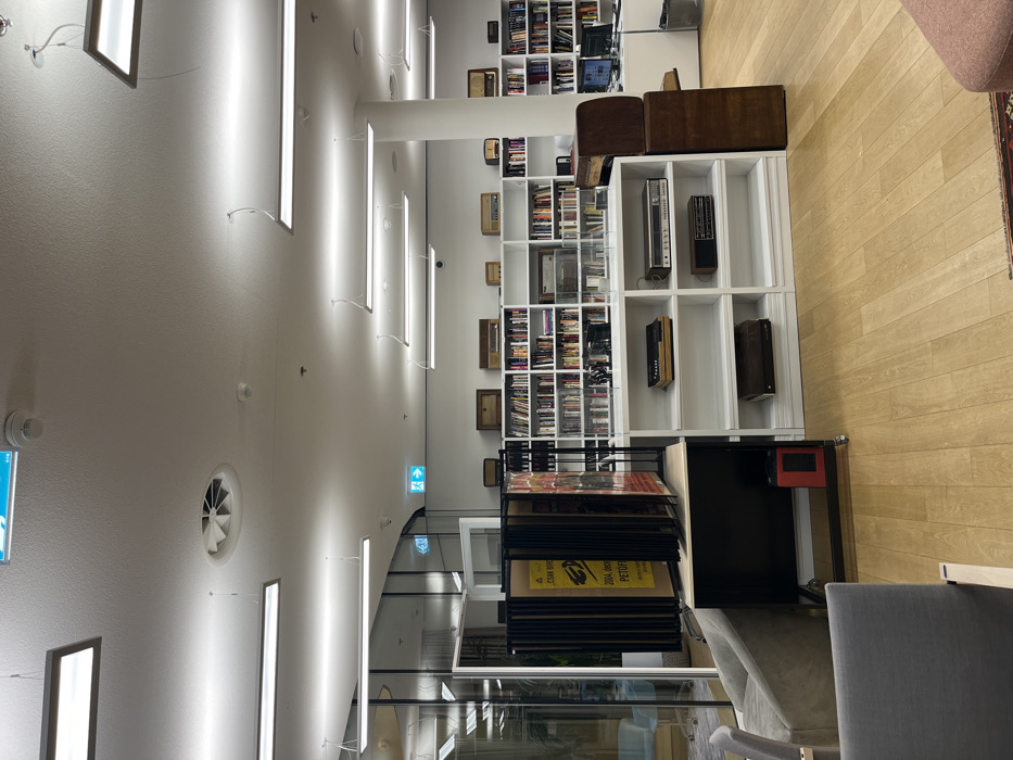 The image displays the interior of a contemporary library or cultural space, identified as the Petőfi Literary Museum (Petőfi Irodalmi Múzeum) located in Budapest, Hungary. The space is well-lit by numerous rectangular and circular ceiling-mounted LED fixtures, with a circular ventilation grate, smoke detectors, and a small black CCTV camera also visible on the white ceiling. Two green emergency exit signs point left and right. The floor is light-colored wood, with a small section of a patterned rug visible in the bottom right corner. To the left, a modern glass partition with black frames separates the main area from an adjacent space, revealing light blue lounge chairs and foliage; an open glass door provides passage. In the mid-ground left, the back of a grey upholstered armchair and a light grey two-seater sofa are positioned. A prominent black, metal, revolving display rack with a light wooden top stands left of center, showcasing large prints or posters. One visible yellow poster features the text "2004. télen" and "PETOFI". Beneath this rack, a red, square-shaped device rests on the floor. Along the back wall, multiple white, open-shelf units are arranged. These units are largely filled with books. The central sections of the shelving units also prominently display a collection of vintage radios and audio equipment on their tops and within lower shelves, some protected by clear barriers. Additionally, modern audio components, including a turntable and a receiver, are visible on lower shelves. A thick, white, cylindrical pillar stands in the right-central portion of the room. To the far right, two computer workstations with dark monitors and chairs are visible beyond the shelving. A tall, dark brown, wooden cabinet with a curved top is situated near the pillar. The scene is devoid of any individuals.