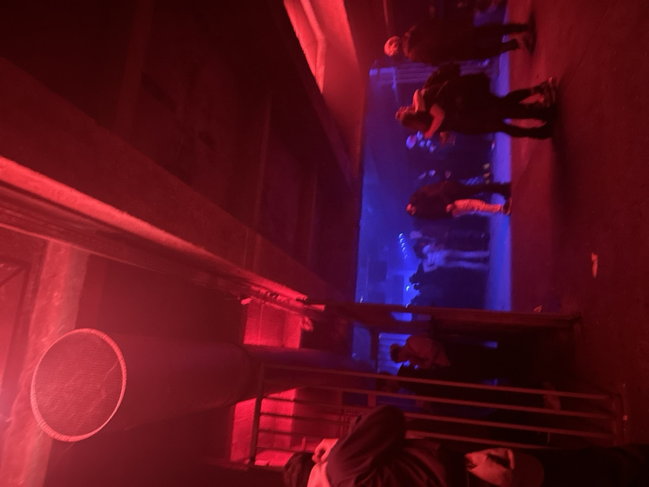 A crowd of people gather in a dimly lit room illuminated with blue and red lights. The photo appears to be taken from an elevated position, possibly a balcony or upper level. Metal beams and structural elements are visible, adding an industrial feel to the scene. A cylindrical vent or duct is prominently featured in the foreground, bathed in red light. The overall atmosphere suggests a concert, club, or similar event with a vibrant and energetic ambiance.
