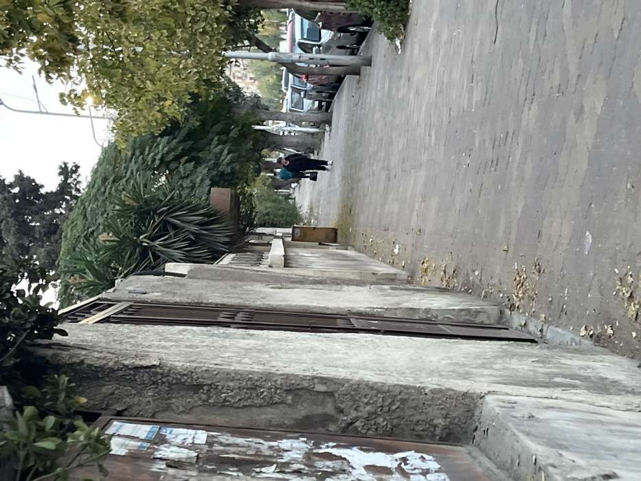 The image displays an urban street scene in Sarouja Municipality, Syria. The perspective is from a sidewalk, looking forward along its path. On the left, a textured, weathered concrete wall with a dark brown metal gate extends into the midground. Patches of white, peeling paper or posters are adhered to the wall's surface. A dense, dark green plant with sword-like leaves grows behind the wall. The sidewalk, composed of interlocking pavers, is strewn with scattered dry leaves and minor debris. Two individuals are observed walking away from the viewer on the sidewalk; the closer person is dressed in dark clothing with white shoes and carries a dark item in their left hand. To the right of the sidewalk, a street features a continuous line of parked sedans. A row of trees with predominantly green and some yellowish foliage lines the street, situated between the sidewalk and the parked vehicles. A multi-armed streetlight pole is visible on the right side, extending above the cars. In the background, additional buildings are partially visible through the trees, under an overcast sky.