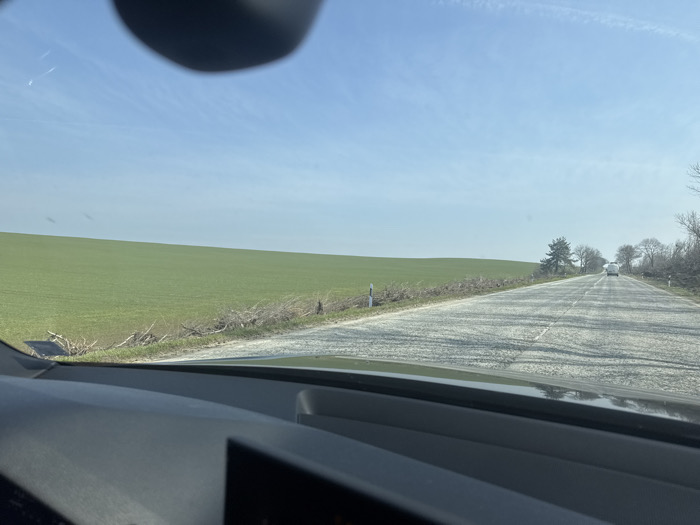 - "A frontal view from inside a moving vehicle depicts a rural road scene in Kozar Belene, Bulgaria, under a clear blue sky with faint contrails" by FM-uEVzD3, licensed under CC BY 4.0