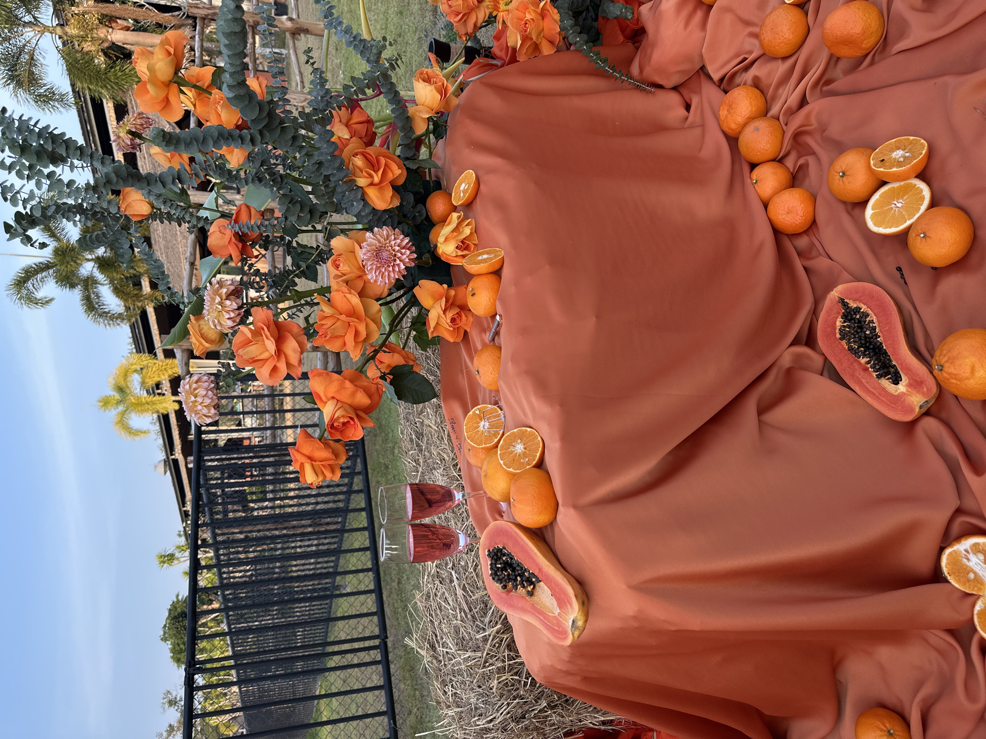 The scene depicts an outdoor decorative display in Si Sunthon, Thailand. A table is draped with a rust-orange fabric, serving as the central element. On the table, two champagne flutes containing a red liquid are placed next to a halved papaya, exposing its black seeds. Several whole and sliced mandarins or small oranges are arranged on the table surface. Behind the table, a prominent floral arrangement features numerous orange roses, several pink dahlias, and eucalyptus foliage. To the left of the table, a bale of hay is partially visible. Additional whole and sliced mandarins are scattered across the draped fabric in the foreground. In the mid-ground, a black metal fence with a square mesh pattern separates the display from a structure with a thatched roof and visible wooden support beams, surrounded by palm trees and other green foliage. The background consists of a clear blue sky. No individuals are present.