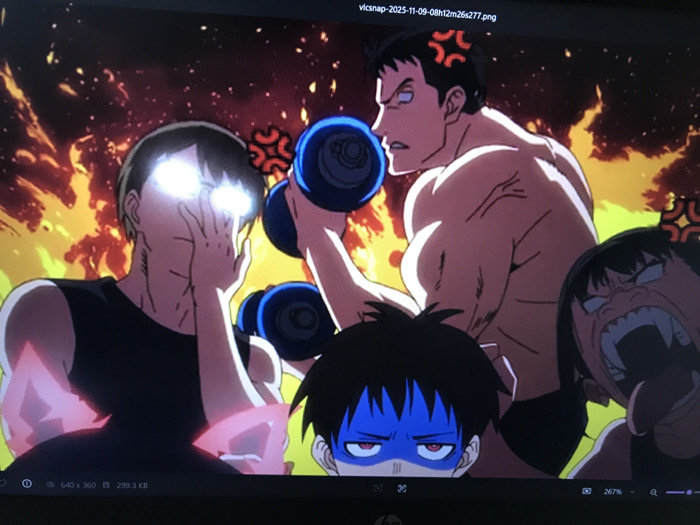 The image is a photograph of a computer monitor displaying an animated scene. The screen's interface shows a filename "vlcsnap-2025-11-09-08h12m26s277.png" at the top. The animated scene features four distinct characters set against a vibrant background of swirling orange, red, and yellow flames or explosive energy, indicating an intense environment. In the central-right, a muscular, bare-chested male with dark, short spiky hair is depicted in profile, facing left. He exhibits a strained, angry expression, emphasized by red "angry vein" symbols floating above his head. He is actively engaged in lifting a blue dumbbell with his flexed right arm. To the left, partially obscured by the muscular male, stands another male character with short dark hair and a dark sleeveless top. His eyes are depicted as intensely glowing white orbs, and his right hand is raised, partially covering his face, suggesting a reaction to a bright light or an internal phenomenon. Pink glowing aura effects are visible around his lower arms. At the bottom center, the upper head and face of a small boy are visible, peeking into the frame. He has dark hair and a blue mask-like covering over his eyes and nose, revealing red-rimmed eyes and an angry or determined expression. To the far right, a partial view of a character's face is shown. This character displays a grotesque, exaggerated expression with a wide-open mouth revealing sharp teeth and a long, distorted tongue, conveying extreme emotion or distress. Red "angry vein" symbols are also present near this character's head. The depicted scene is an animation and, as such, does not represent a real-world physical location in Calabar, Nigeria. The photograph itself was taken of a screen.