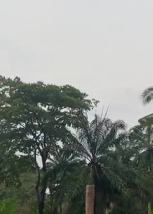 The video presents a medium-distance shot of a tropical landscape under a cloudy, overcast sky. In the foreground, there are various green trees and palm trees of different heights and sizes. A roughly-hewn wooden pole stands towards the right side of the frame, partially obscuring one of the palm trees. In the far background, there is more greenery, suggesting a dense forest or vegetation. The sky is a uniform gray, indicating a cloudy or overcast day. There are no people or animals visible in the frame. The camera appears to be stationary throughout the short clip.