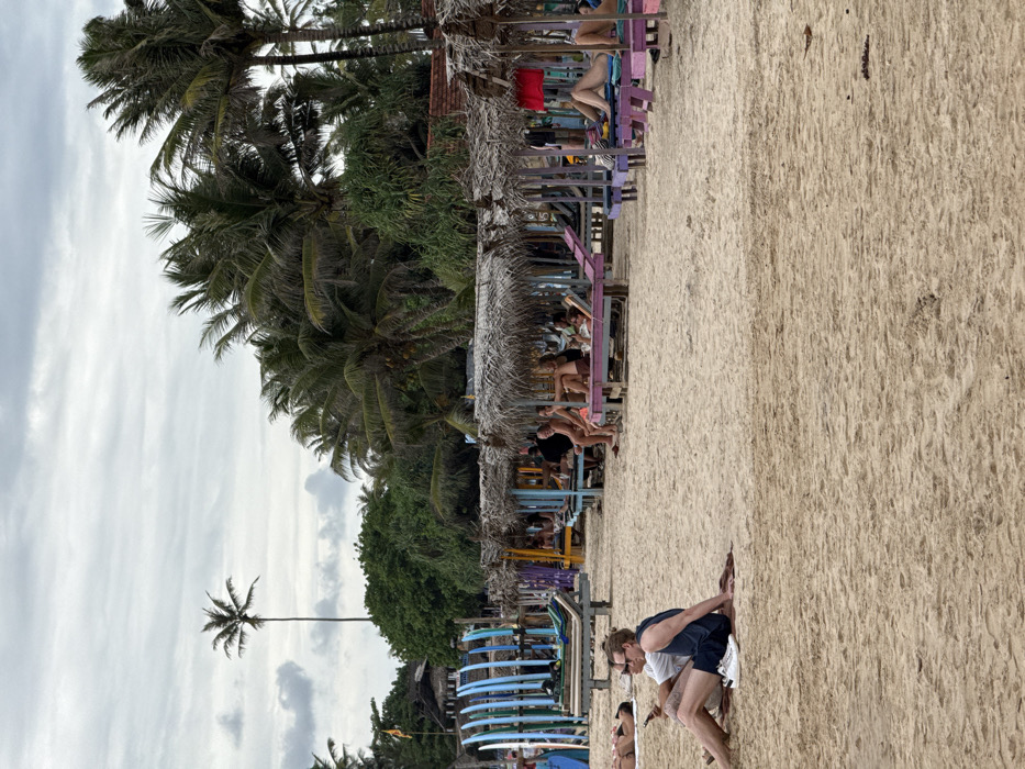 The image captures a sandy beach scene in Kathaluwa, Sri Lanka, under an overcast sky. The foreground consists of light brown sand. In the lower-left, two males are seated on a brown towel; the closer individual, with fair skin and dark blonde hair, wears a white tank top, dark shorts, and white sneakers, holding a black smartphone. A third individual is partially visible lying prone on a dark mat further to the left. The midground displays a row of thatched beach shelters with frames colored blue, yellow, purple, and pink. Beneath these structures, multiple individuals are seated or reclining on lounge chairs. Approximately ten surfboards, colored blue, green, and white, are vertically racked on the far left. To the right of the surfboards, several persons are visible in groups beneath the thatched roofs, some interacting, others relaxing. For instance, four individuals are seated under one pink-framed hut, and another person reclines face-up on a purple lounge chair under a separate hut on the far right. The background is dominated by a dense line of tropical vegetation, primarily tall green palm trees. A slender, prominent palm tree stands out on the left against the sky. A building with a thatched roof and a yellow flag on a pole are visible behind the surfboards. The sky is uniformly grey with scattered clouds. The ocean is not visible within the frame.