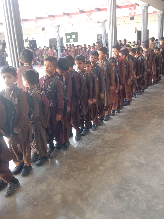 A long line of approximately 40-50 school-aged boys, estimated between 7 and 14 years old, stands in an outdoor covered walkway of a building in a city of Unknown, Unknown. The boys wear brown or maroon traditional uniforms (shalwar kameez style) and dark shoes. Many carry backpacks and display lanyards with identification cards around their necks. The line extends from the foreground to the background, with the boys maintaining a generally attentive posture. The walkway features a light grey concrete floor and a roof supported by numerous white cylindrical columns. Reddish-brown architectural details are visible on the roof structure. In the background, a light-colored building wall displays a dark green geometric symbol. The scene is illuminated by natural daylight.