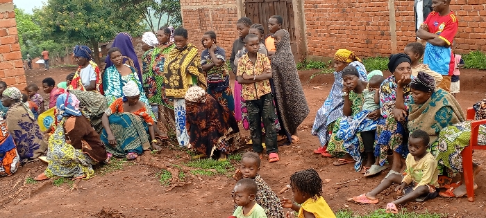 A group of people, mostly women and children, gather in a rural setting with brick buildings in the background