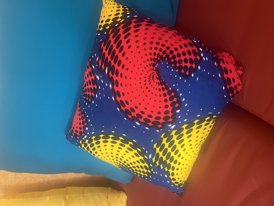 A square throw pillow is displayed with a vibrant, patterned fabric cover. Red, blue, and yellow sections are adorned with black polka dots that give a sense of depth. It rests partially on a teal cushion, with the remaining section on a red surface. A corner of a yellow pillow is also visible beneath.