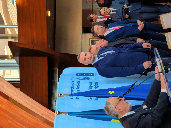 This image depicts a formal indoor event at the Council of Europe building in Strasbourg, France